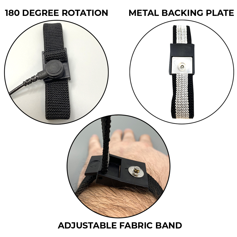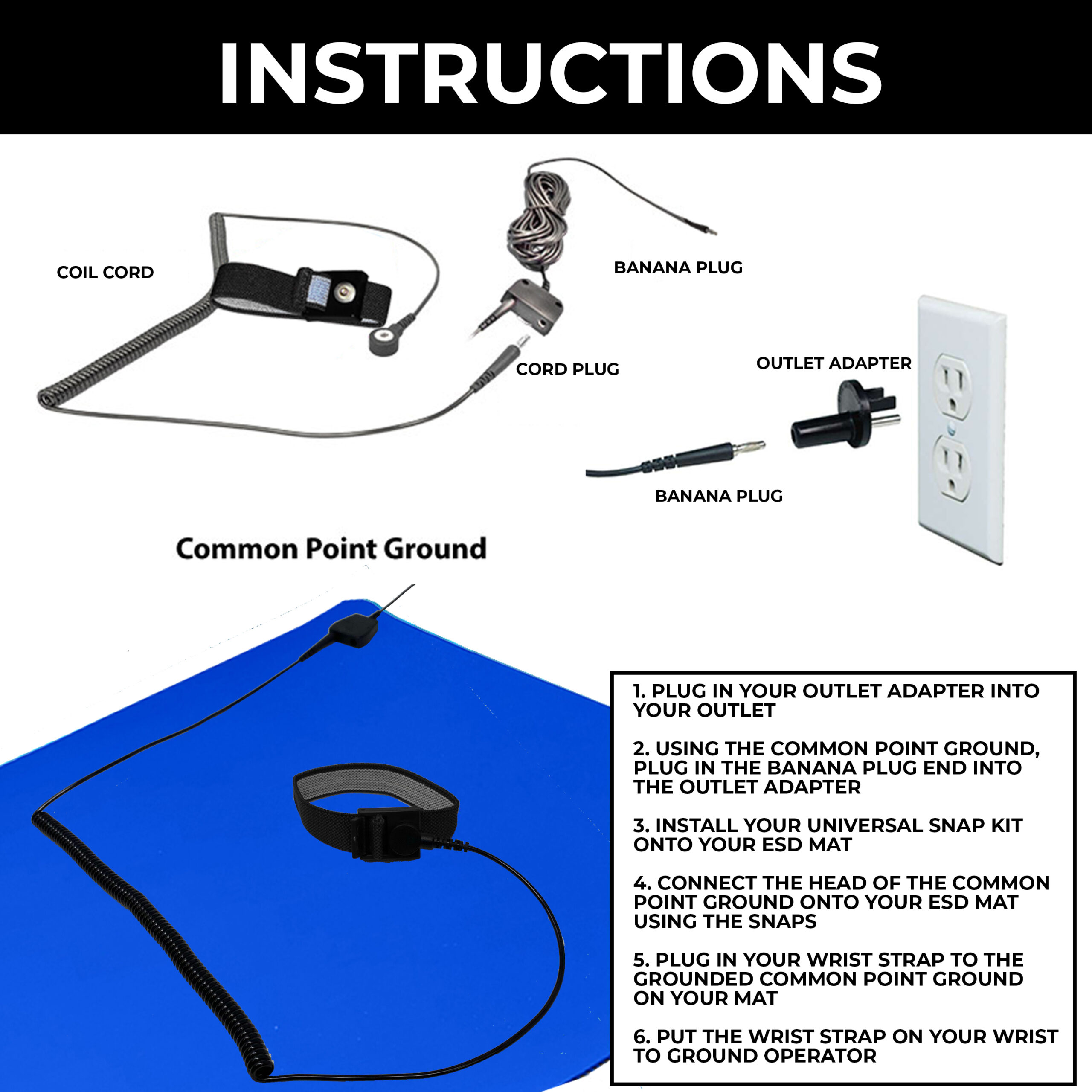 • COMPLETE ESD KIT: This anti-static, multi-purpose kit is composed of a 16"x24"x0.060" mat, one wrist band with a 4mm snap and 6' coil cord w/ alligator clip, one 15' ground black PVC cord made with 7 strand tinsel wire with a banana plug and dual standard banana jacks, a USA banana jack plug adapter and a universal snap kit with multiple size screws to put into your mat