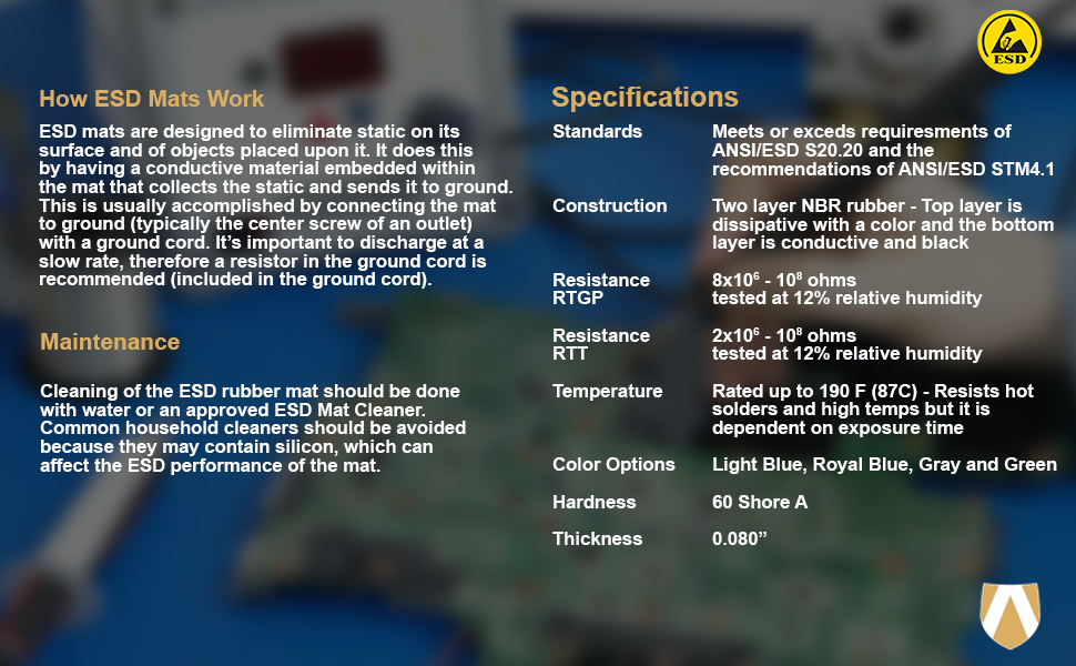 • ESD PROTECTION: Designed for an electronic assembly where static charge is a concern. The ESD High Temperature Mat Kits have a top layer made of static dissipative rubber and a bottom layer made of black conductive rubber.
